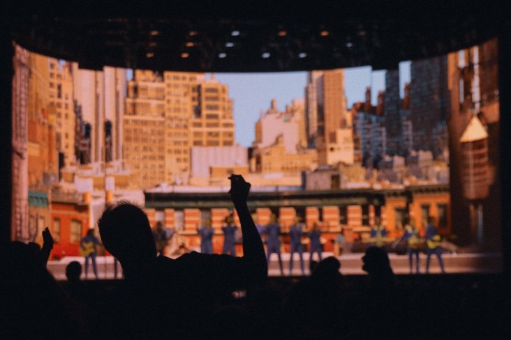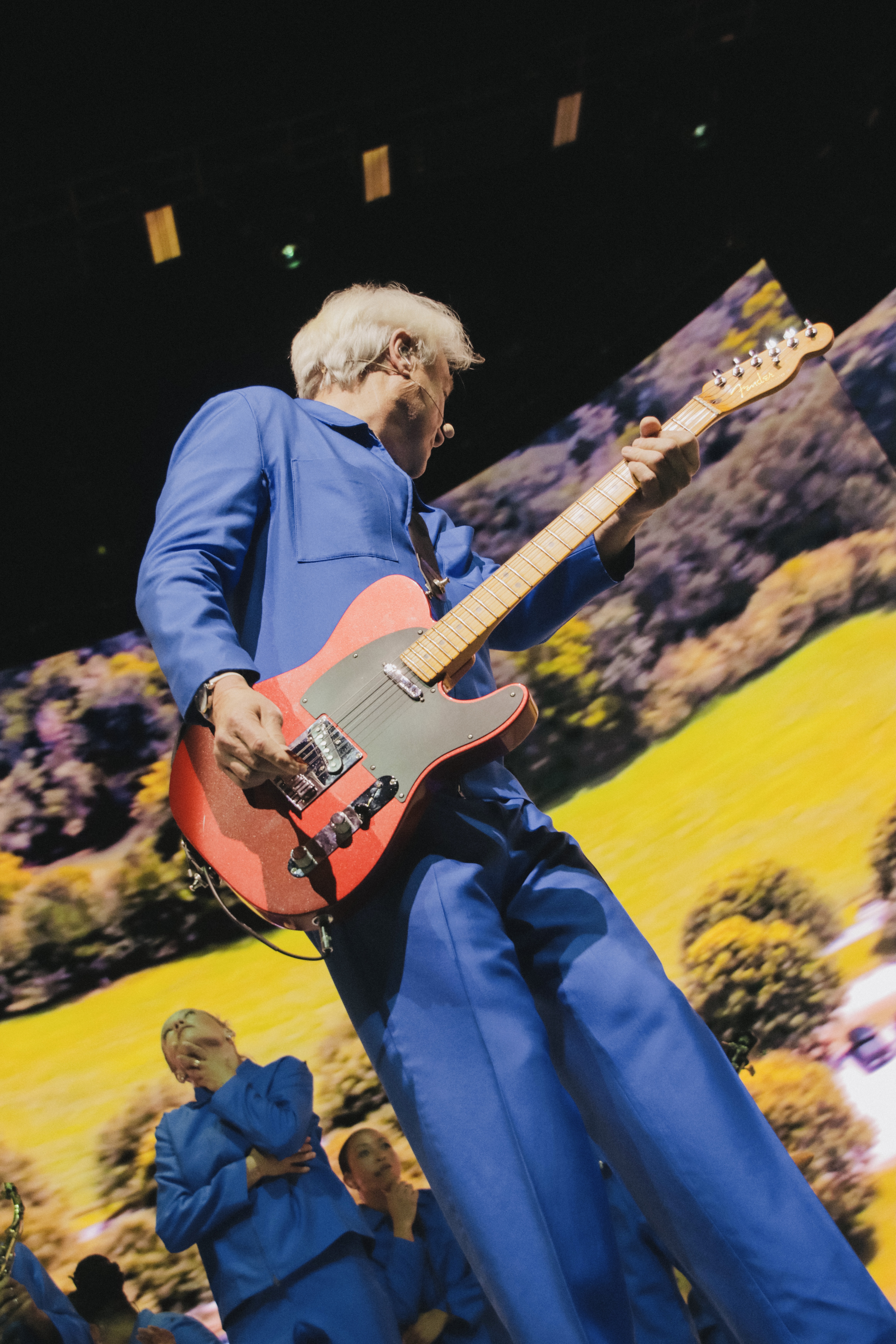 The Spark Arena audience, much like the weather in Auckland that day, was mostly grey on top. (My people!) But there was no lack of energy. Excited chatter filled the waiting space as the massive stage monitors displayed a point-of-view shot situated on the moon’s surface. The dimming of the light drew a roar of anticipation from the crowd, matched only by the adoring screams that followed Byrne’s appearance at centre stage, flanked by three musicians, all clad in the same shade of blue, their instruments strapped to their bodies. As the opening number, Heaven resounded around the arena, Earth appeared slowly on the stage monitor, giving the impression that we were looking out at our home. When the number finished, Byrne pointed at our little planet. Telling the audience, "There she is, our heaven, the only one we have". That simple gesture was enough to orient the audience in the direction the show would take. An exploration of what it means to experience life on earth, to be human amongst other humans.
