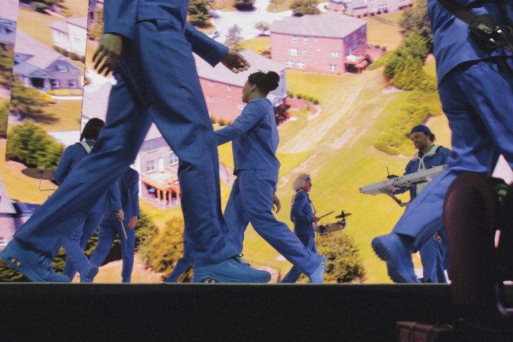 In a sense, the live show presents a microcosm of that more egalitarian world that Byrne strives for. The transformation of a band into a community is something he first explored in his Talking Heads days. “The band became a more abstract entity, a community. And while individual band members might shine or take virtuosic turns, their identities became submerged within the group.” You can see the throughline of this ethos in the ‘Who is The Sky?’ Tour. Every one of the thirteen musicians onstage wore the same shade of blue. From my seat, they were only really distinguishable by the instrument (or lack of instrument) that they had strapped to their bodies. Amongst the perpetual motion of the slick choreography, it was easy to lose Byrne, as he became one with the band and dancers. I need to give a special mention to Kely Cristina Pinheiro, who laid down fat basslines all night long.